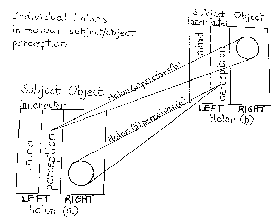 Wilber’s model is a bird's eye view abstraction which sets, in a correlative fashion, the language of the objective world simply alongside the language of experience. But this mapping does not give an answer to the mind/brain and mind/world relation except to note (though inadequately as said above) the obvious non-reductive correlation of experience and brain state. In our revised LEFT/RIGHT model, a person is not a mind, not a brain, not both a mind and brain, but a holonic mind/brain or mind/body by virtue of the epistemic relation to another holonic mind/body. What we have here is actually a map based on the mutual perceptual relationship of two holons (be it animals or persons). Each holon is mapped as a LEFT/RIGHT Janus-faced relation. The RIGHT is the objective experience from the perspective of the other which belongs on this other's LEFT—that is, on the Right hand facet of the LEFT(see diagram)! That which distinguishes RIGHT from LEFT is precisely, and nothing more than, the self/other relation. That which distinguishes the so-called realm of 'mind' from the so-called realm of 'world' is that A shows up as B's world and B shows up as A's world. The objective form of A is revealed as the subjective experience of B and vice versa.