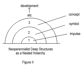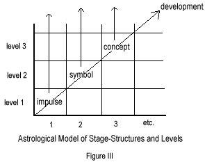 It is centrally significant that in mapping our softer universalist astro-transpersonal model, we cannot meaningfully say of archetypes (i.e. in this case, the twelve signs/houses) that any one stands 'higher' than any other as they do in Wilber’s holarchically nested model where, for example, conceptual reason stands higher than mythic imagination (Fig. II). Yet there are indeed earlier and later stages and levels of development, evolutionary and devolutionary trajectories, optimal and pathological expressions, lesser or greater dimensionalities, For example, psychologically speaking, a lower level of the first sign Aries includes instinctual precipitous action and aggressivity while a higher manifestation would be pioneering courage, strong and appropriate assertiveness. These higher and lower expressions or manifestations of each archetype, astrologers have called the higher and lower octaves of a sign, house or planetary configuration which in terms of spatial modelling, require mapping along an axis at right angles to the two axes describing the zodiacal circle.