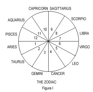 For those who are not familiar with the astrological mandala, Fig I shows the two- dimensional chart circle, the multifaceted backdrop against which the ever-changing angular geometry of the planets unfolds. The circle is divided fundamentally into four quadrants by two orthogonal axes—the horizon and the meridian. In terms of the twelve houses—first, second, third etc—the two axes situate the planets in relation to any point on the Earth’s surface. In terms of the twelve signs—Aries, Taurus, Gemini etc.—the two axes signify the equinoctial (horizon) and solstitial (meridian) points of the Earth’s annual journey around the sun—i.e. from a geocentric perspective. The axes mark fundamental transition points, points whose significance in terms of the diurnal motion of the planetary bodies has been actually confirmed statistically by the scientific research of Michel Gauquelin 4. In addition, since the mandalic geometry also reflects the angular relations of the planets to each other, in terms of their corresponding archetypal meanings, these four points reflect the meanings of the most significant quadrature aspects—the conjunction, opposition and the two squares formed by the cyclic relation of any two planets. The archetypal mosaic is to be understood not only structurally but processively, not only geometrically but as a dynamic and complex process of change and development as the cycle unfolds from one sign to the next, the process repeating, sometimes at more mature levels, through successive cycles of emergence and unfolding.